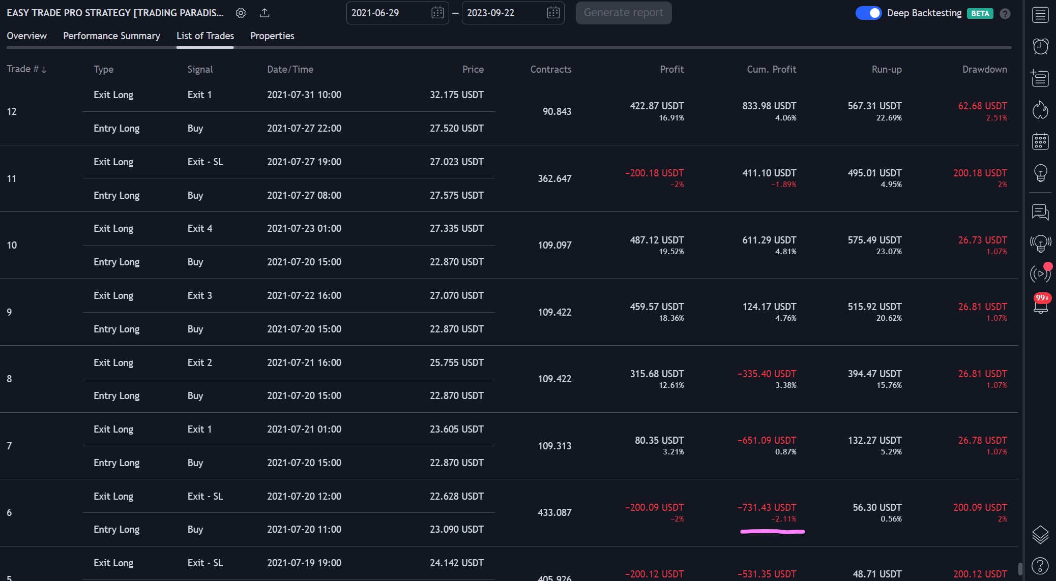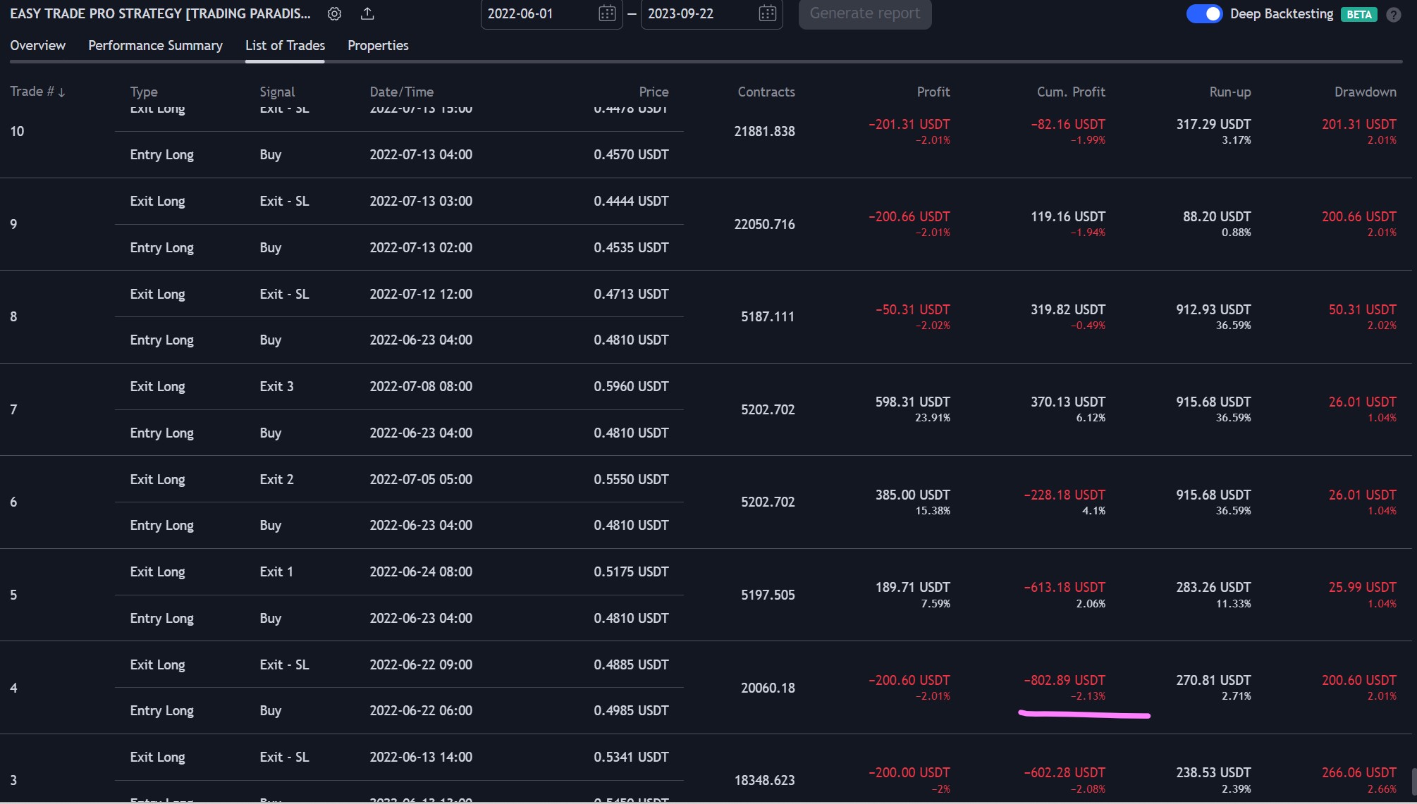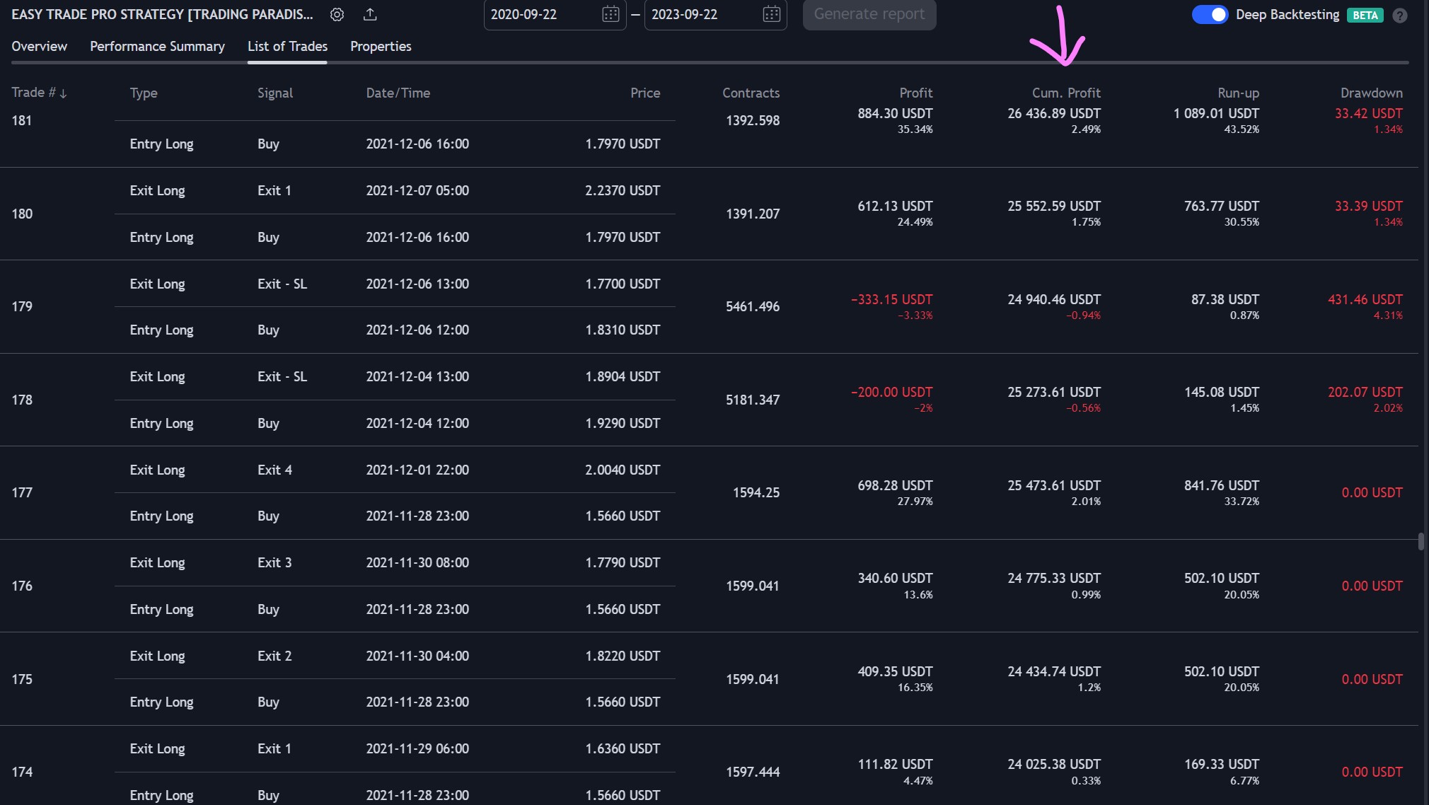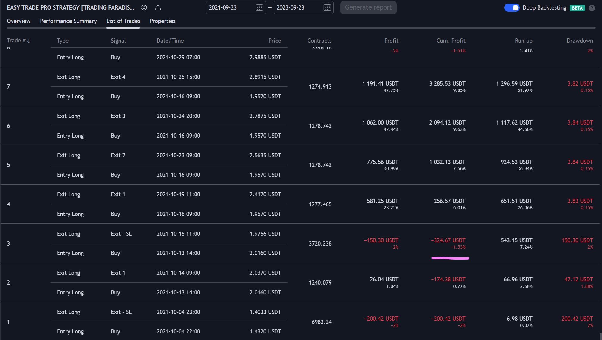 For a detailed breakdown of individual trades, including points where the strategy was in negative profit, you can refer to the trades list in the provided PDF. This can provide a more granular understanding of the strategy's performance over time.