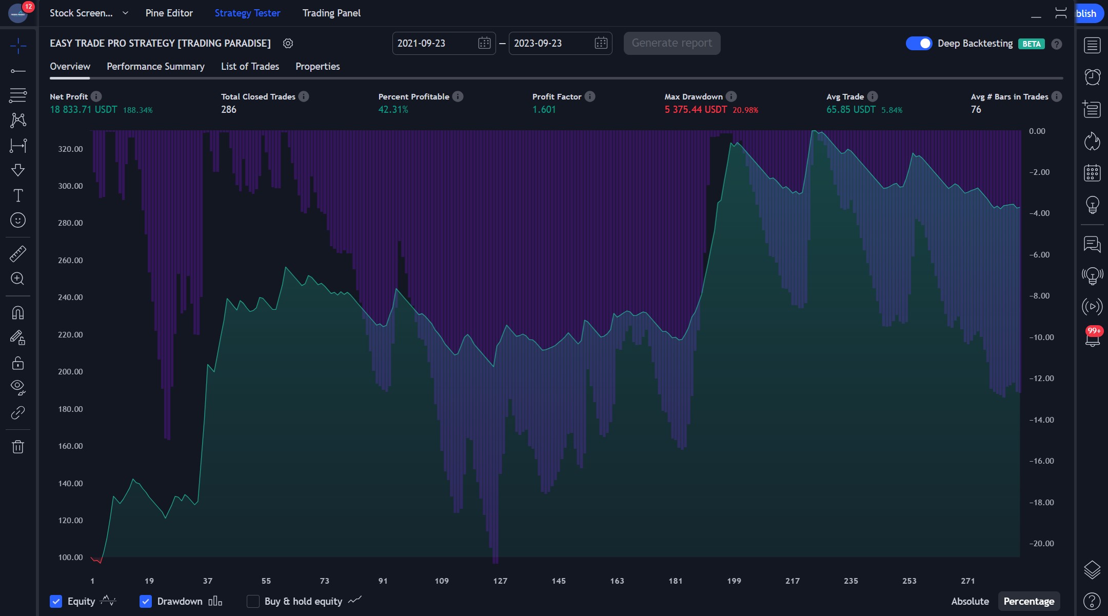 Our trading strategy has showcased impressive results. Out of 286 closed trades, we secured a 42.31% win rate, leading to a net profit of $18,833.71, a 188.34% increase from our initial $10,000 capital. While the drawdown was 20.98%, our strategy showed resilience with the Maximum Underwater metric registering a minor dip of just $324.67 on 2021/10/15. So basically we were down only by 3.24% compared to our capital.