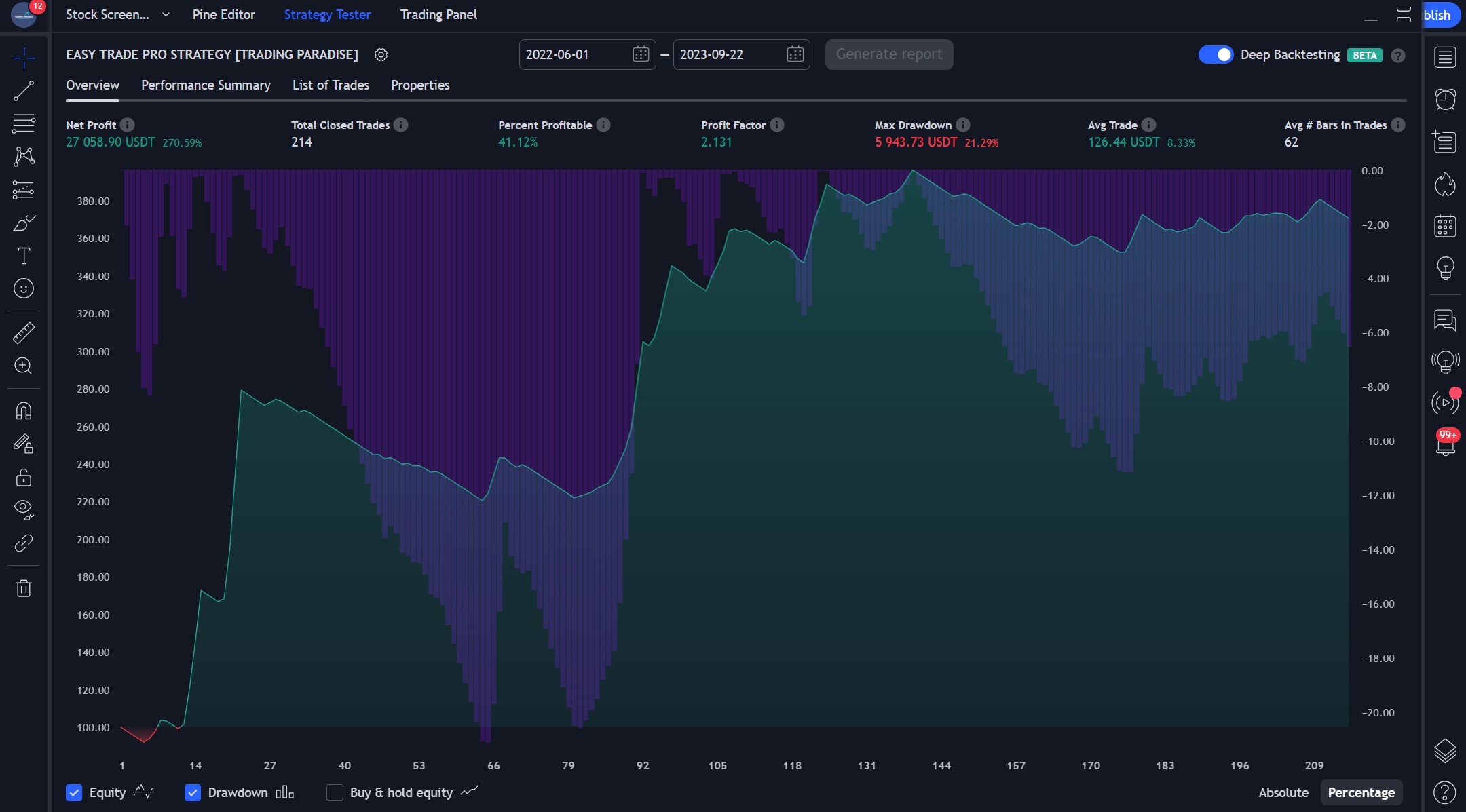 Our trading strategy has showcased impressive results. Out of 494 closed trades, we secured a 41.12% win rate, leading to a net profit of $27,058.90, a 270.59% increase from our initial $10,000 capital. While the drawdown was 21.29%, , our strategy showed resilience with the Maximum Underwater metric registering a minor dip of just $802.89 on 2022/06/22.