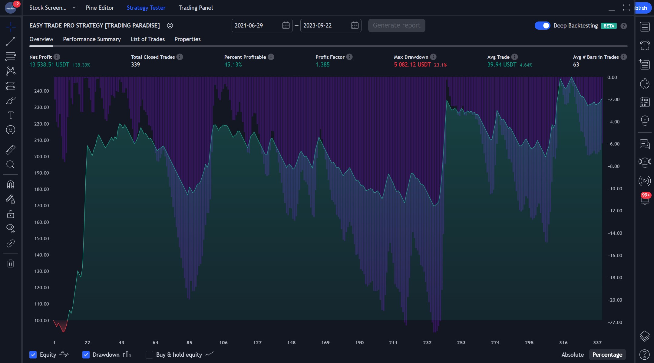 Our trading strategy has showcased impressive results. Out of 339 closed trades, we secured a 45.13% win rate, leading to a net profit of $13,538.51, a 135.39% increase from our initial $10,000 capital. While the drawdown was 23.1%, our strategy showed resilience with the Maximum Underwater metric registering a minor dip of just $731.43 on 2021/07/20. So basically we were down only by 7.31% compared to our capital.